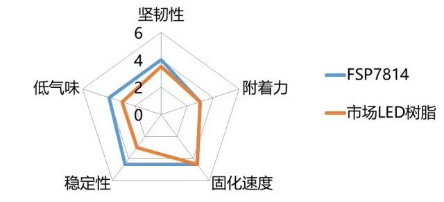 由於在uv led固化機下,FSP7814固化速度快,雙鍵轉化率較高,所以能夠形成較好的交聯網絡,實測可通過沸水煮一小時測試,表觀無變化,無起泡,不發白,附著力未下降。這一特點使其可以滿足UV膠等高端應用的耐水、高溫高濕性能的測試要求。